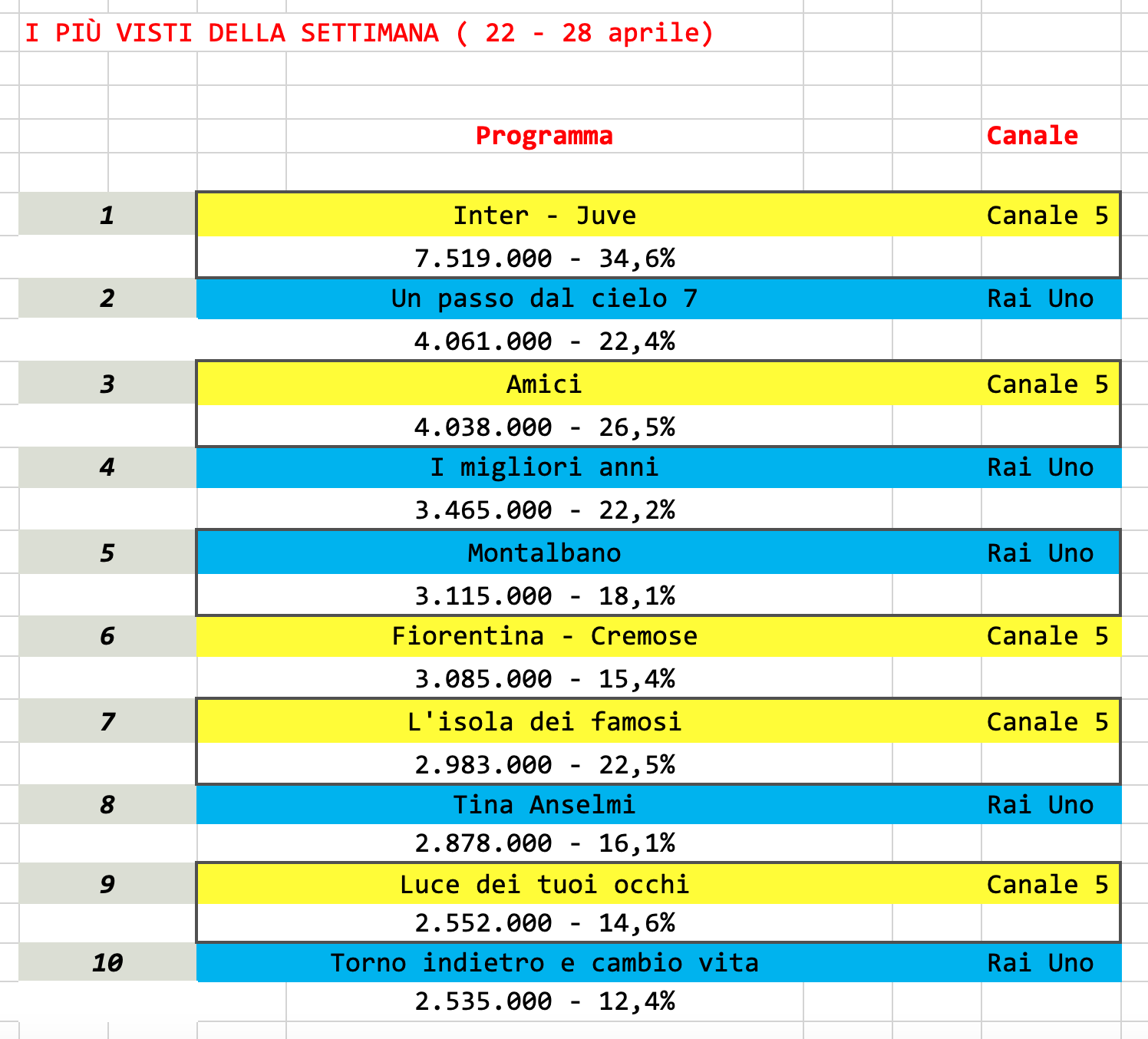 Analisi auditel dal 22 al 28 aprile. Il calcio, la fiction e il ritorno dell’intrattenimento in Rai.
