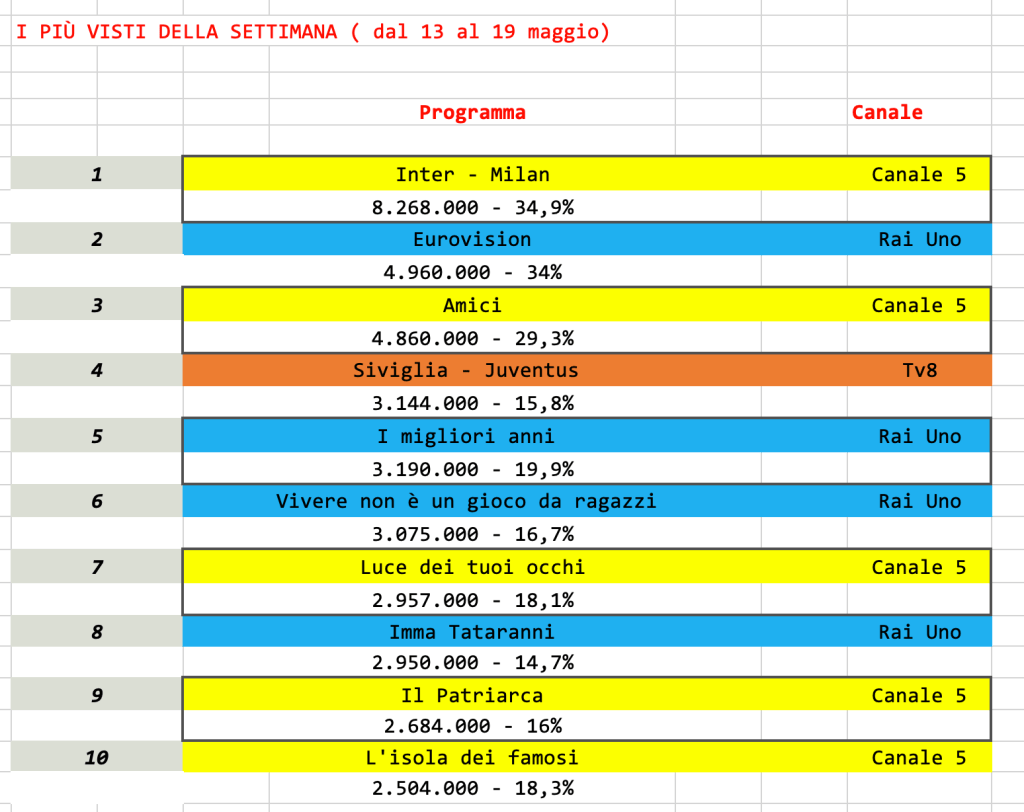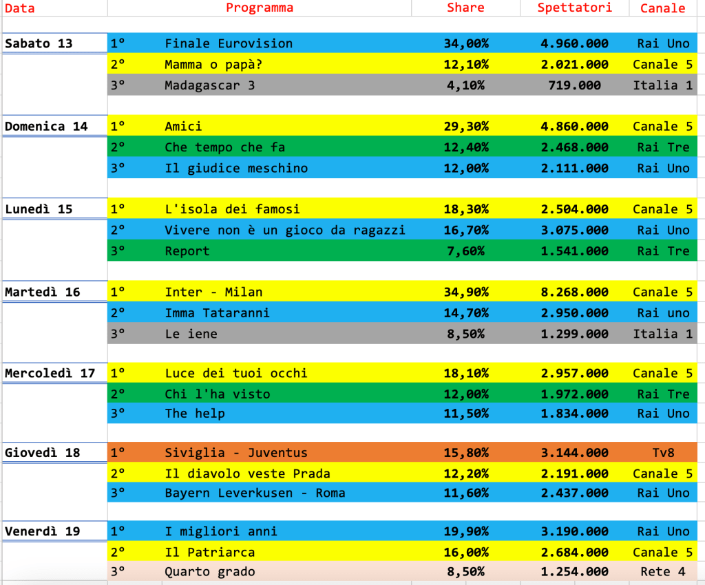 Bene la finale dell’Eurovision, in onda su Rai uno e condotta dalla coppia Corsi – Maionchi. Terzo posto per la finale di Amici, eccezionalmente in onda di domenica.