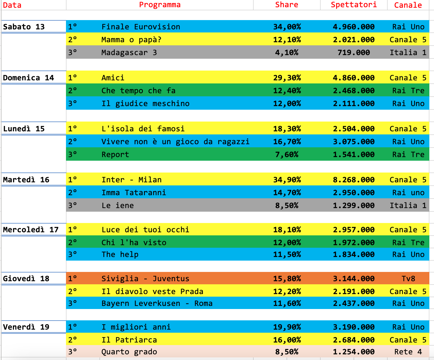 Bene la finale dell’Eurovision, in onda su Rai uno e condotta dalla coppia Corsi – Maionchi. Terzo posto per la finale di Amici, eccezionalmente in onda di domenica.