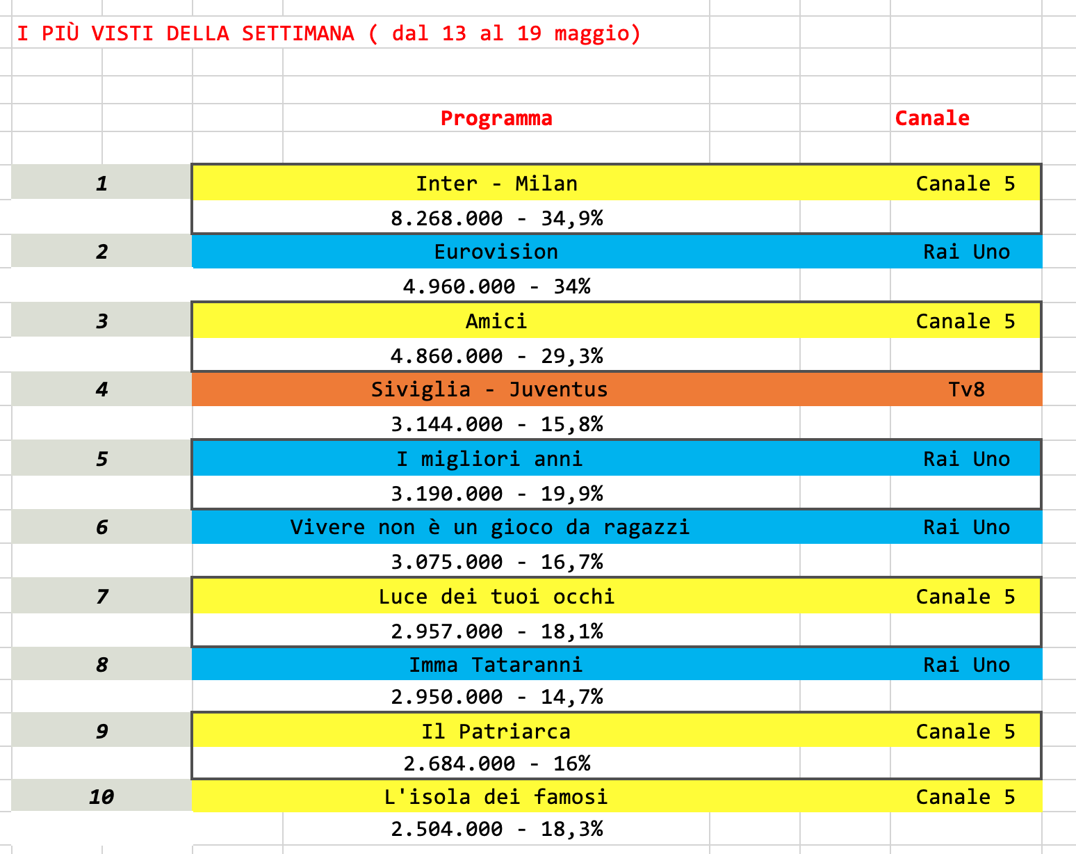 Infatti, al primo posto, in onda su canale 5, troviamo Inter – Milan, la partita è stata vista da più di otto milioni di spettatori.