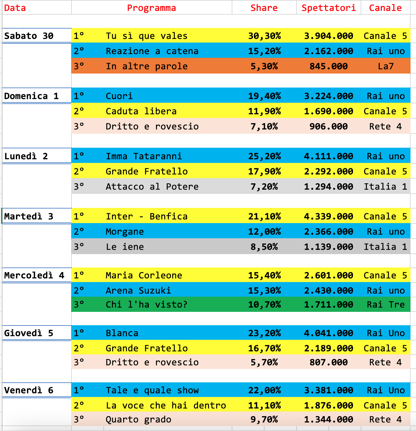Ciò che spicca è però il grande successo di Tale e quale show che addirittura doppia la poco fortunata serie con protagonista Ranieri, La voce che hai dentro.