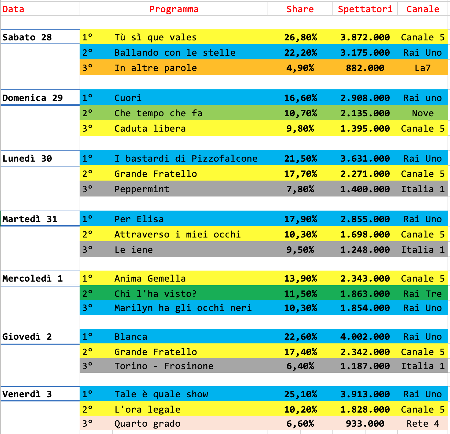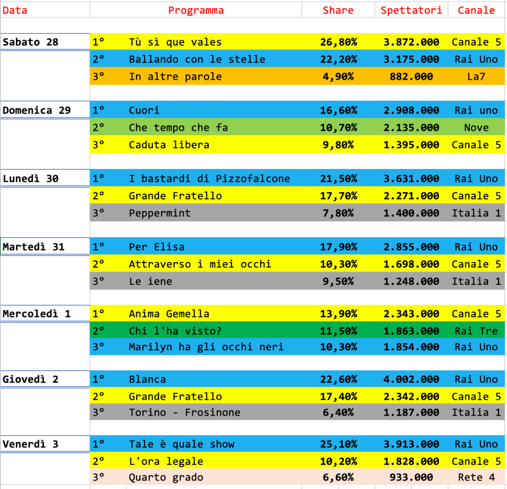 Analisi auditel dal 28 ottobre al 3 novembre, la Rai annaspa rimanendo a galla solo grazie ai pochi punti di forza rimasti.