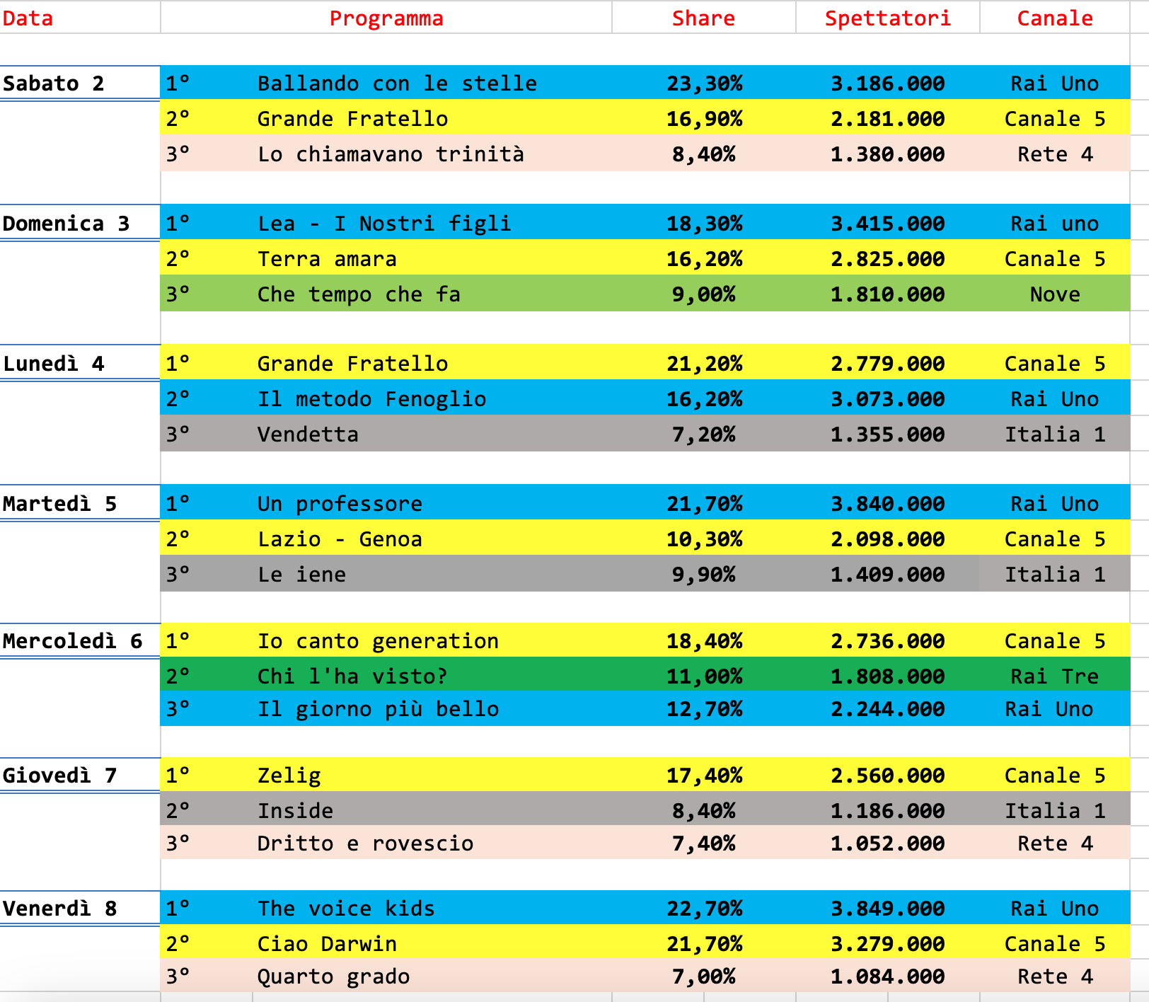 Arriviamo così a venerdì, serata in cui Ciao Darwin cede il passo ad un The voice kids che vola al 22,7%. Per Antonella Clerici è stata una settimana ricca di soddisfazioni, non solo il suo programma in prime time è il più visto, ma anche È sempre mezzogiorno ha raggiunto il 19% di share medio settimanale, con una puntata di festa, quella del 6 dicembre, giorno del suo compleanno, che ha visto tra i tanti auguri di amici e colleghi (Mara Venier, ad esempio, arrivata a sorpresa in studio) quello di Barbara Palombelli, sua diretta competitor con Forum. Realizzando, così, un crossover sui generis tra le due reti. Un momento d’oro quello della Clerici, che con semplicità e allegria, anche nei momenti più delicati, ci fa compagnia nel mezzogiorno italiano con ascolti più che soddisfacenti.