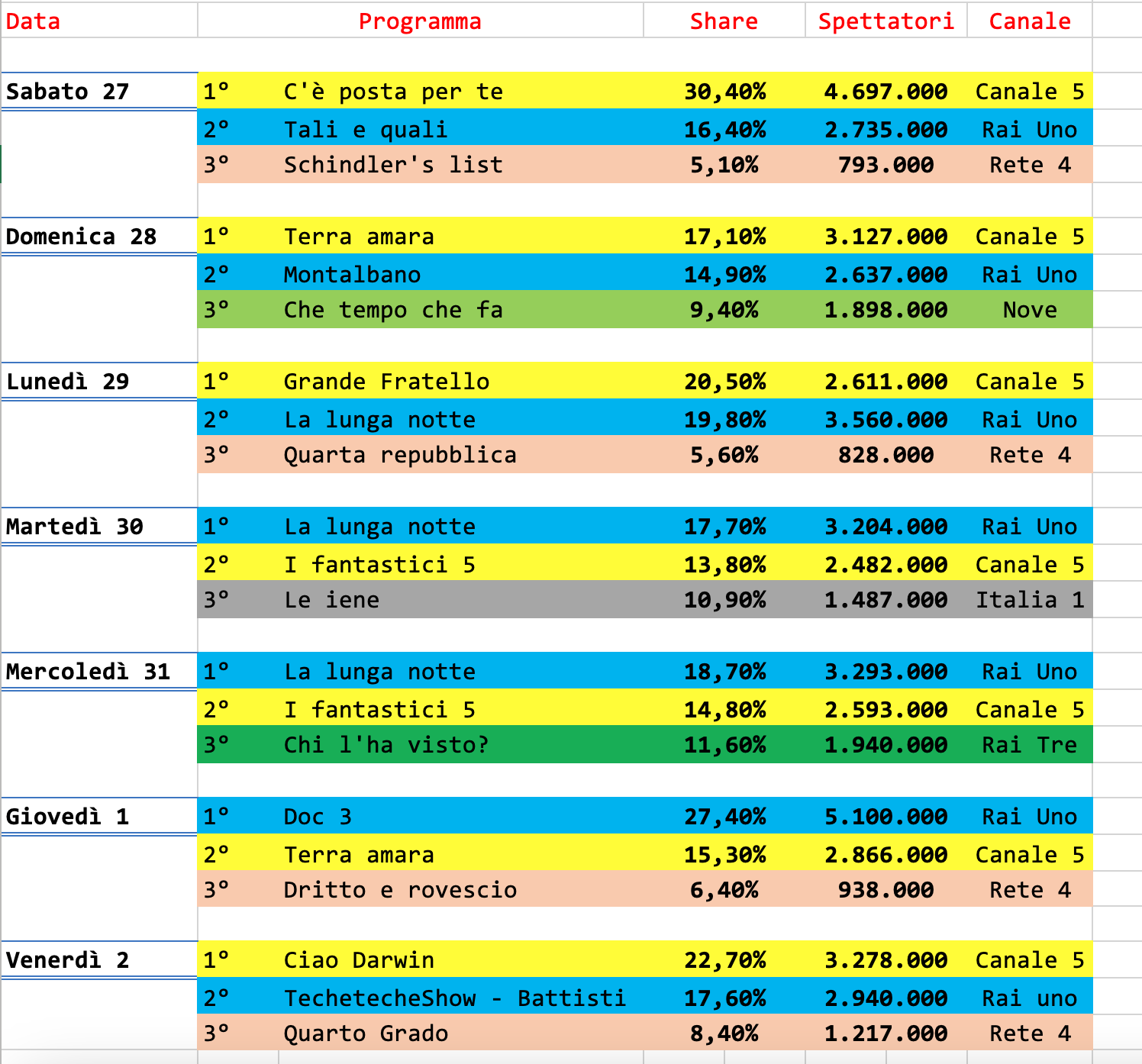 Andando con ordine la finale di Tali e quali rimane ferma ai box, sorpassata ampiamente da C’è posta per te. Anche Montalbano, non accattivante per il pubblico Rai, fa segnare il record di stagione a Terra amara.