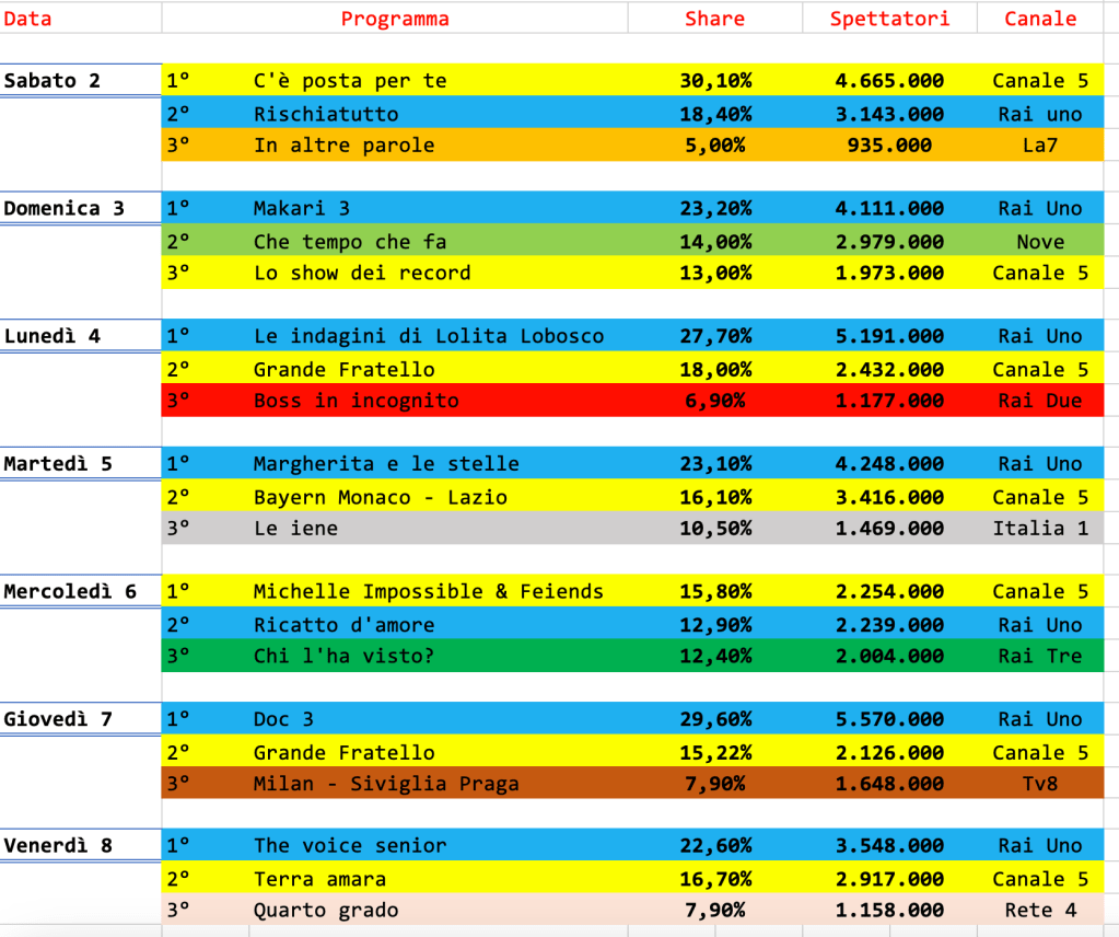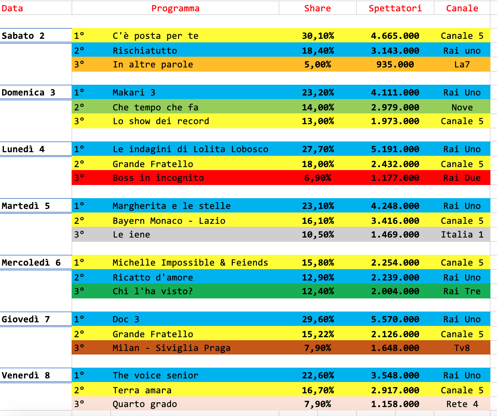 Domenica 3, invece, Che tempo che fa sorpassa e si posiziona al secondo posto con il 14% e quasi 3 milioni di spettatori.