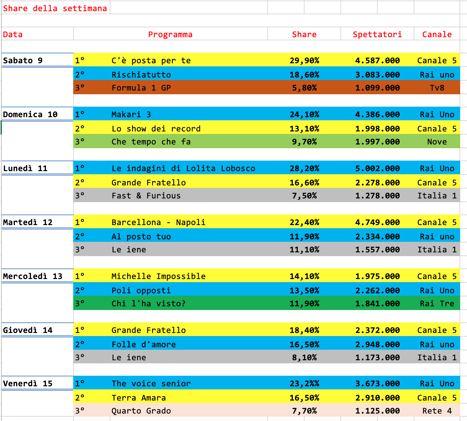 Ore 14 al 7,84% e Bella ‘ma al 6,32%. Pomeriggio cinque tra il 15,36% e il 13,87%.
