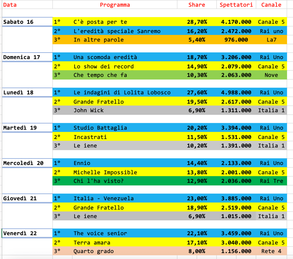 Benissimo Le indagini di Lolita Lobosco che surclassa il Grande Fratello. Esordio leggermente più in sordina per Studio Battaglia (le ultime due puntate andranno in onda martedì 26 e giovedì 28 marzo). Ormai la Rai ci sta abituando a queste serie toccata e fuga. Una programmazione che di certo non le valorizza, ma del resto questa è stata anche la settimana della grande figuraccia. Dopo promo su promo, crossover con Doc 3 e chi più ne ha più ne metta, Don Matteo 14 (già fatto slittare di qualche settimana) andrà in onda addirittura in autunno. Motivazione: l’essersi accaparrati una serie di partite di Europa League in onda il giovedì sera e altri eventi sportivi. Non si può certo dire che si sia trattata a dovere una fiction che macina ascolti record da fine anni ’90.