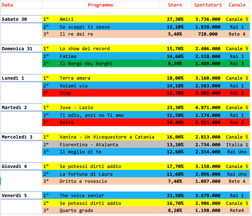 Il colpo d’occhio parla chiaro, Rai Uno vince solo venerdì, mentre per gli altri sei giorni lascia campo libero a Canale 5 che, con la minima spesa, ne approfitta. Le due fiction Vanina e Se potessi dirti addio se la cavano bene, con ascolti medi (per la rete) e conquistano il primo posto, mentre Rai Uno arranca con repliche o film per la Tv di qualità bassina.