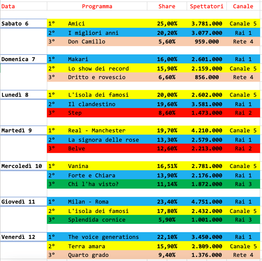 Nel day time È sempre mezzogiorno si assesta al 17%. La volta buona rimane tra il 13,22% e il 15%. Il paradiso delle signore (che sta per giungere al termine della messa in onda) arriva al 21,55% di share medio settimanale.