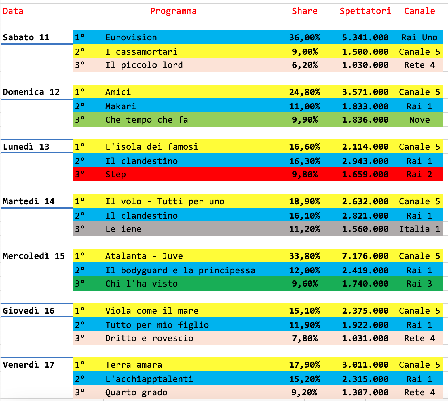 Andiamo con ordine, in questi sette giorni presi in considerazione spiccano la partita di finale di coppa e l’Eurovision con numeri altissimi.