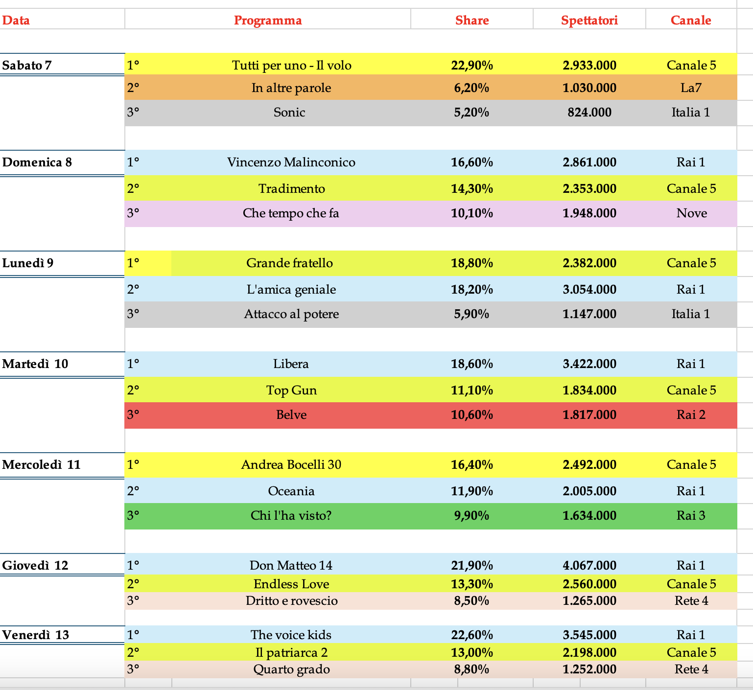 Nel day time vediamo il record stagionale per È sempre mezzogiorno con il 18% di share medio settimanale. La volta buona oscilla tra il 13,43% della prima corposa parte e il 16% degli ultimi quaranta minuti di programma. Bene Il paradiso delle signore con il 19,41%. Ottimo risultato anche per Vita in diretta tra il 20% e il 21,5%. Ancora ottimi risultati per Ore 14 con l’8,39% di share a cui segue Bella ‘ma con il 6,97%. Pomeriggio cinque si assesta, invece, sul 13,4%.