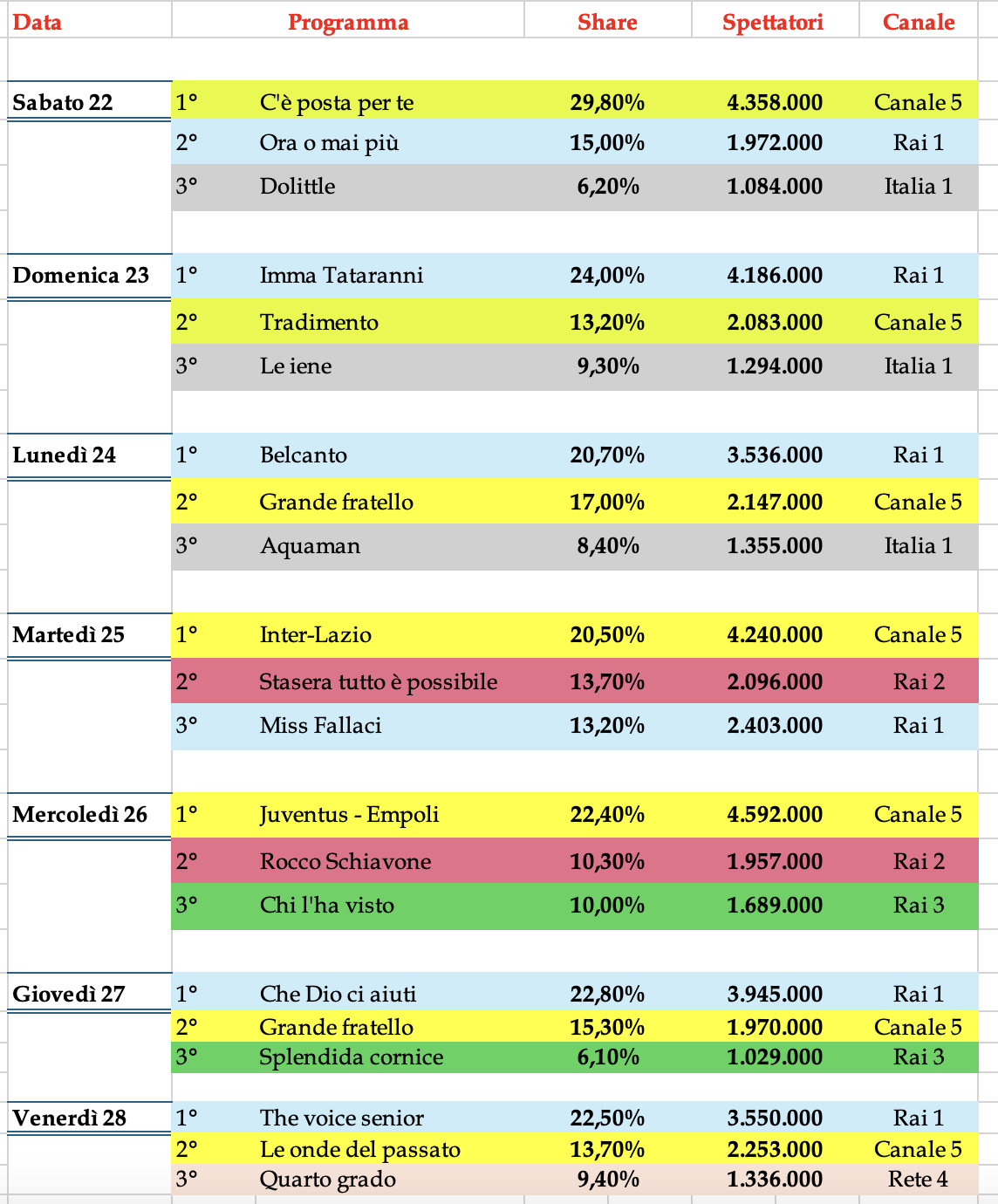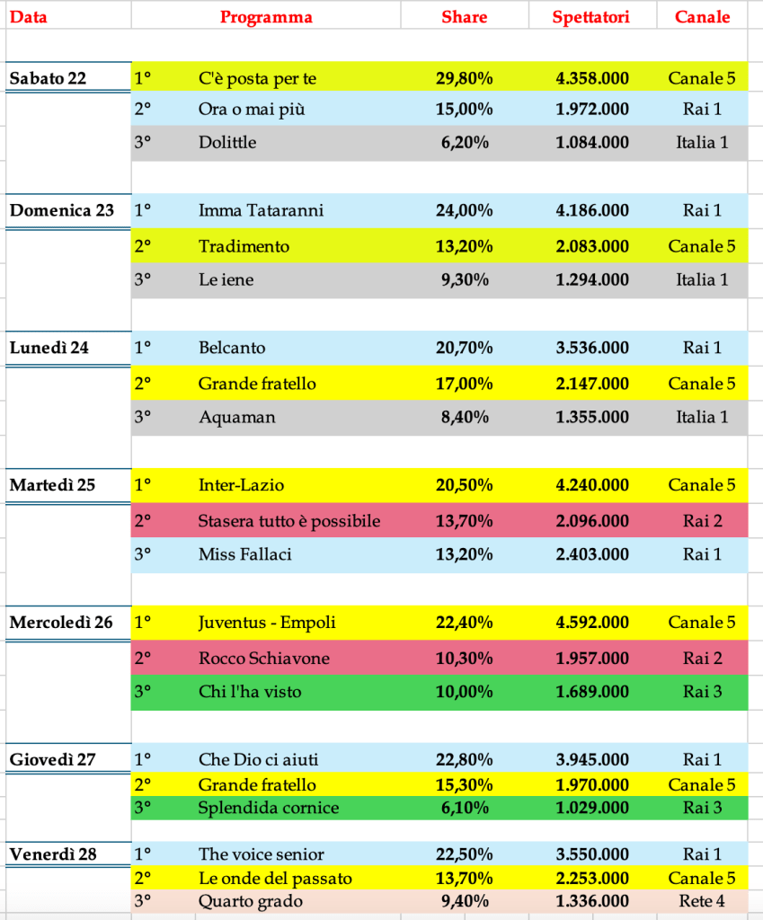 Anche Rai Tre con la colonna Chi l’ha visto, ma anche con Splendida Cornice, si posiziona al terzo posto per due giorni consecutivi.