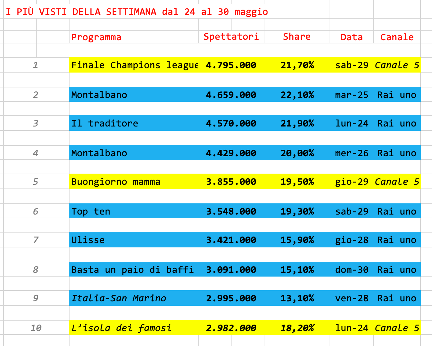 Sono solo tre i programmi Mediaset che entrano in Top Ten, sembra essere tornati indietro nel tempo, mentre Rai Uno festeggia un day time in cui pochi avrebbero scommesso. Il primo posto lo ottiene la finale di Champions, che però, comunque, non va oltre i quasi 4,8 milioni di spettatori. Le ultime due repliche (finalmente)ContinuaContinua a leggere “Ascolti, canale 5 si salva grazie a Bova”