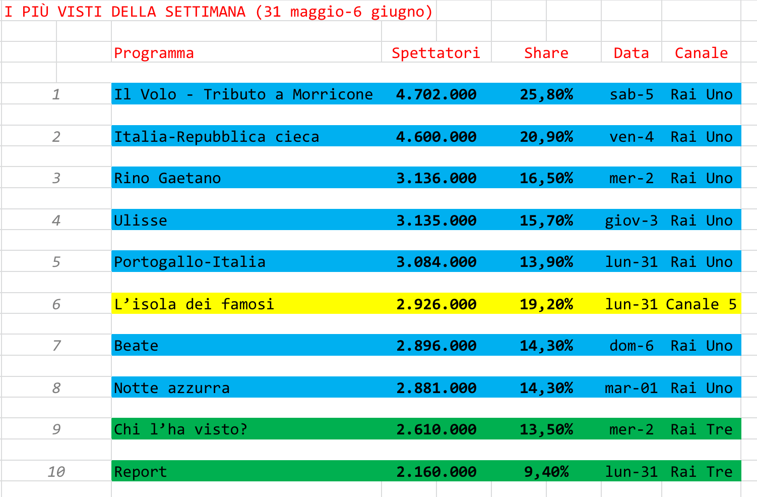 Ormai è arrivata l’estate e la platea televisiva si è visibilmente ridotta, sarà interessante vedere, dopo mesi di limiti, quanti rimarranno a casa, a partire dal 11, per godere degli europei. Per quanto riguarda questa prima settimana di giugno è quasi impressionante la Top Ten, un solo prodotto Mediaset si aggiudica la classifica e perContinuaContinua a leggere “I tre tenori fanno spiccare il volo a Rai Uno”