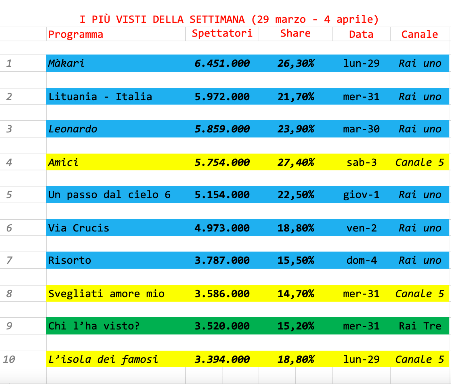 Ascolti alti, molta fiction e un po’ di religiosità nella settimana che si è conclusa con la domenica di Pasqua. Makàri chiude la prima stagione con ascolti altissimi, più di sei milioni di spettatori. Il suo diretto competitor,L’isola dei famosi, finisce al decimo posto della TopTen. La partita Lituania – Italia si aggiudica il secondo posto della classifica.ContinuaContinua a leggere “Vola la fiction, anche targata Mediaset, ma non solo”